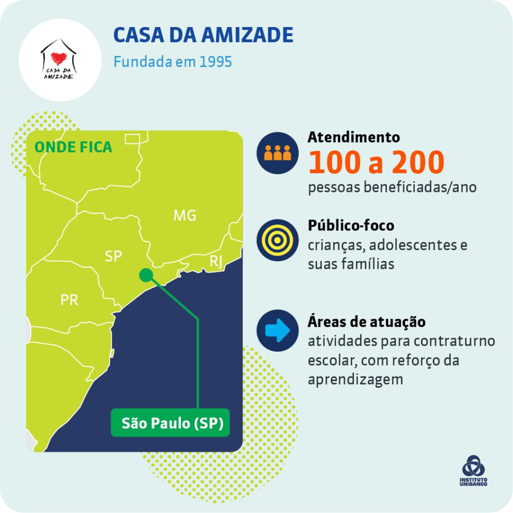 A Casa da Amizade foi fundada em 1995, em Paraisópolis, na área mais vulnerável da segunda maior comunidade do município de São Paulo, conhecida como Grotão de Paraisópolis. No início de sua história, a organização distribuía alimentos, mas, com o passar do tempo e a necessidade de atender outras demandas da população, implementou aulas de capoeira e atendimento médico com terapias alternativas.