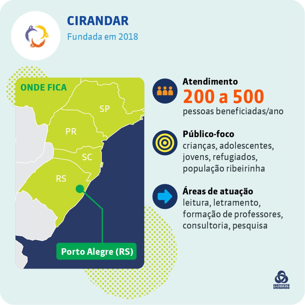 As bibliotecas comunitárias são foco da Cirandar, que acredita que a leitura é um direito humano essencial para conscientização, curiosidade e empoderamento das pessoa. Por isso, apoia ações e projetos relacionadas à formação de leitores. Seu trabalho ajudou a fortalecer a Rede de Bibliotecas Comunitárias de Porto Alegre, um coletivo de mais de 15 bibliotecas, que integra a Rede Nacional de Bibliotecas Comunitárias (RNBC).
