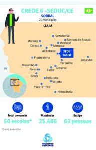 Em Sobral (CE), as reuniões da Crede 6 com todas as escolas, antes mensais, passaram a ser realizadas toda semana e remotamente. “Até porque toda semana tinham deliberações novas da Secretaria”, explica o coordenador Daniel. Paralelo a isso, cada equipe da Crede fazia seus encontros ao longo da semana com os técnicos da escola. “Eu desenhava o atendimento geral com a equipe segunda e depois cada célula [núcleos de trabalho da regional] fazia o seu desenho de interação com as escolas. Por exemplo, a coordenadoria administrativa-financeira se encontrava com os assessores financeiros da escola.”