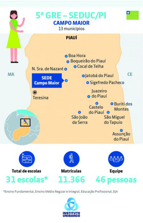 Sediada em Campo Maior (PI), município localizado a 80 km de Teresina, a 5ª GRE abrange 31 escolas distribuídas por 13 municípios.