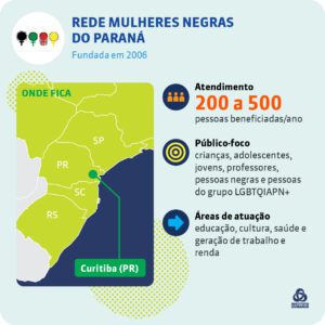 Fundada em 2006 para reivindicar e ampliar a implementação de políticas públicas voltadas às demandas da população negra, especialmente mulheres, a Rede Mulheres Negras do Paraná desenvolve projetos que visam à valorização e ao resgate da identidade e ancestralidade negra do estado.